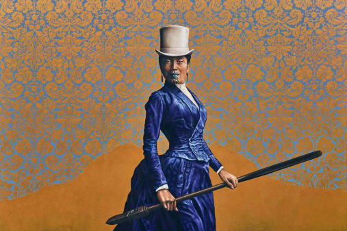 "Aoraki Fractalis is a surreal, interdimensional view of Aoraki Mt Cook, Ngāi Tahu's sacred mountain, as seen from the Hooker Glacier terminal lake. Triangular patterns, found in eastern sacred geometry, mathematical fractals and traditional Maori art, are painted in shiny, metallic gold and dominate the realm of Rakinui - the Sky Father. White snow from the mountain drips as a waterfall to the bottom of the painting where curious saffron-robed buddhist monks serenely walk by. To Sofia the monks represent a human element of flesh, blood, religion and culture, attempting to connect to a larger cosmic picture."
