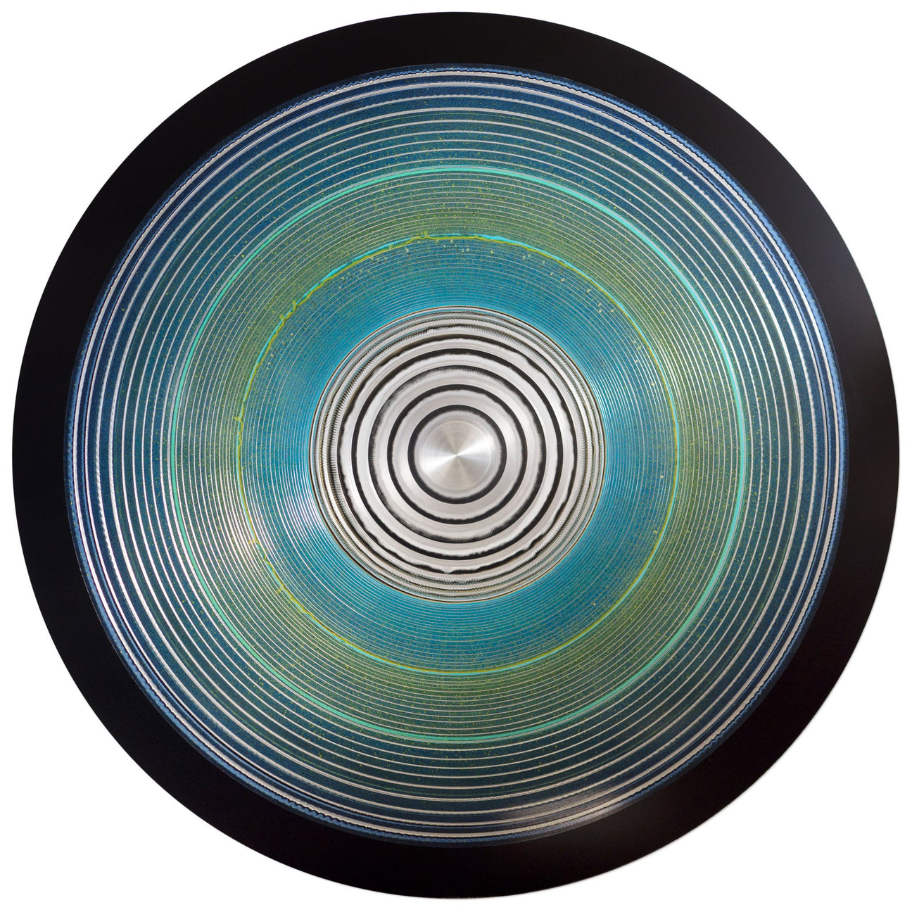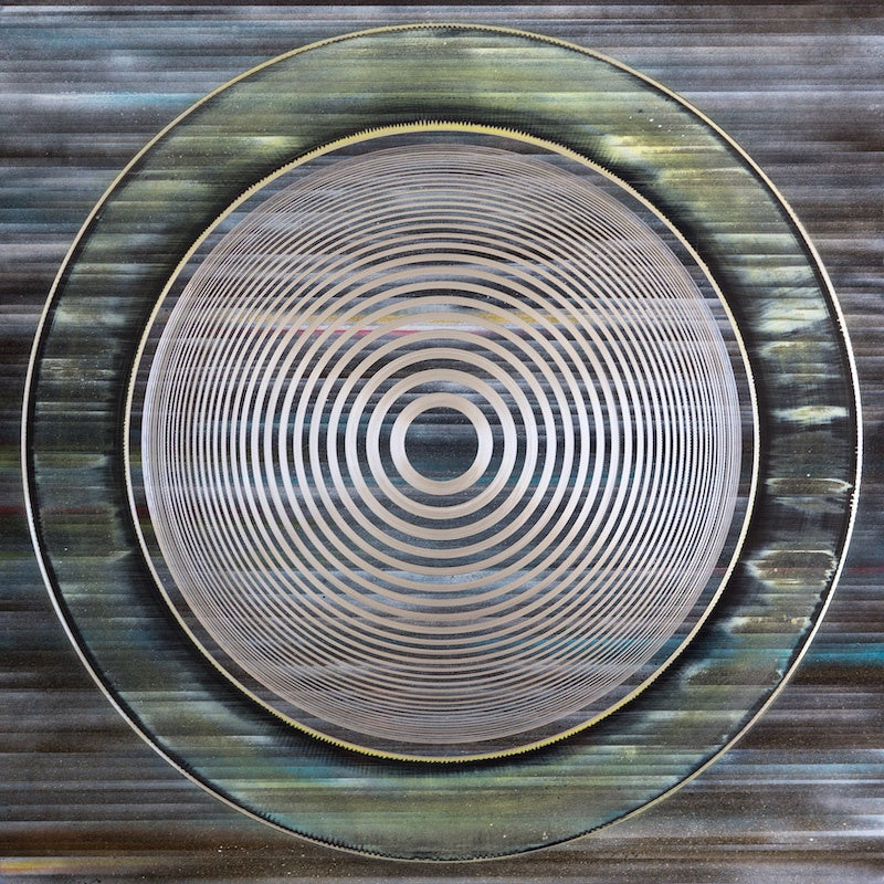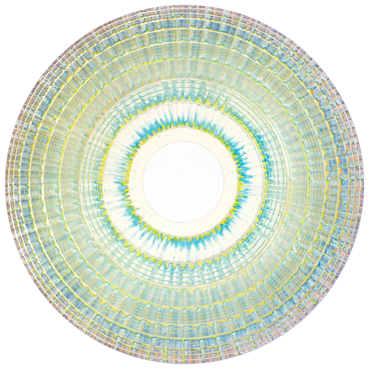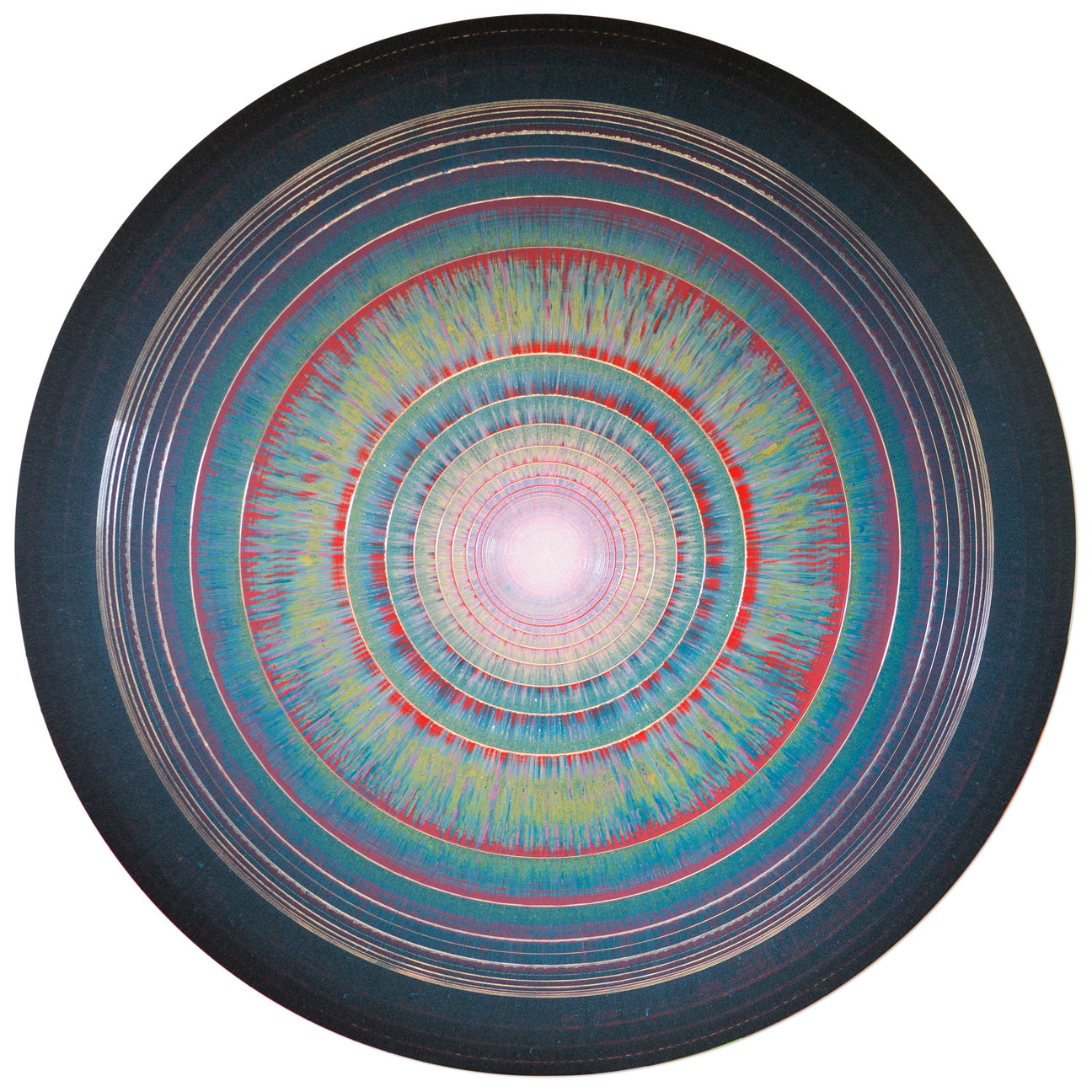 Etched concentric circles radiate outward and contract inward. Che's paintings pulse with energy and flow that bring to mind dynamic motifs of sound and light, the network of life, growth and reflection.