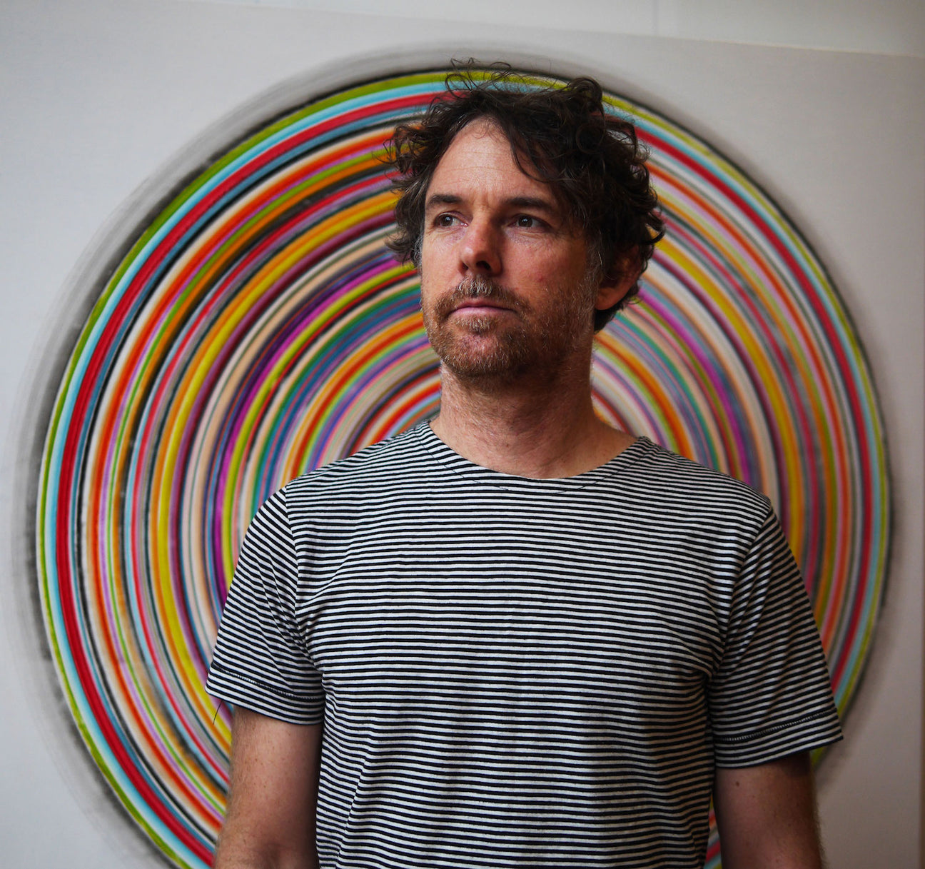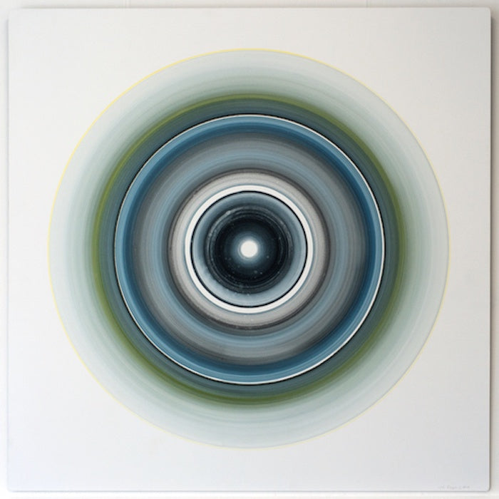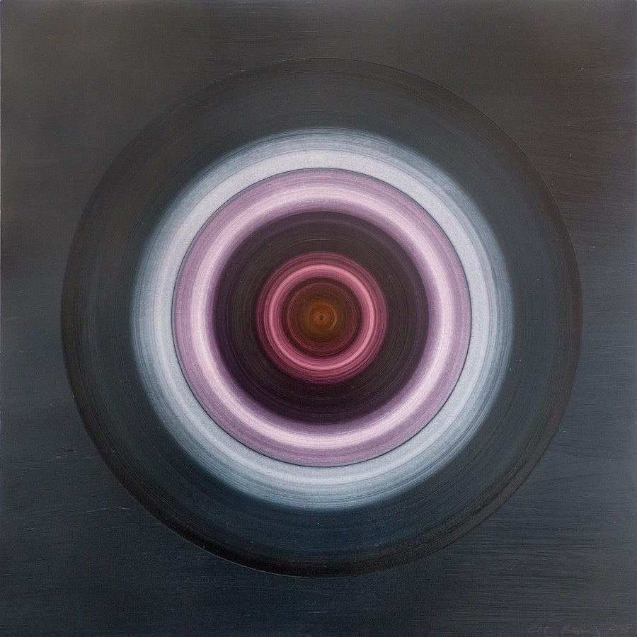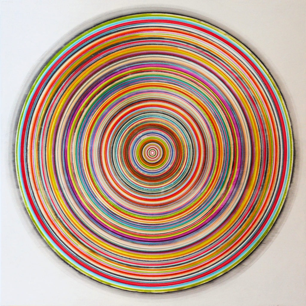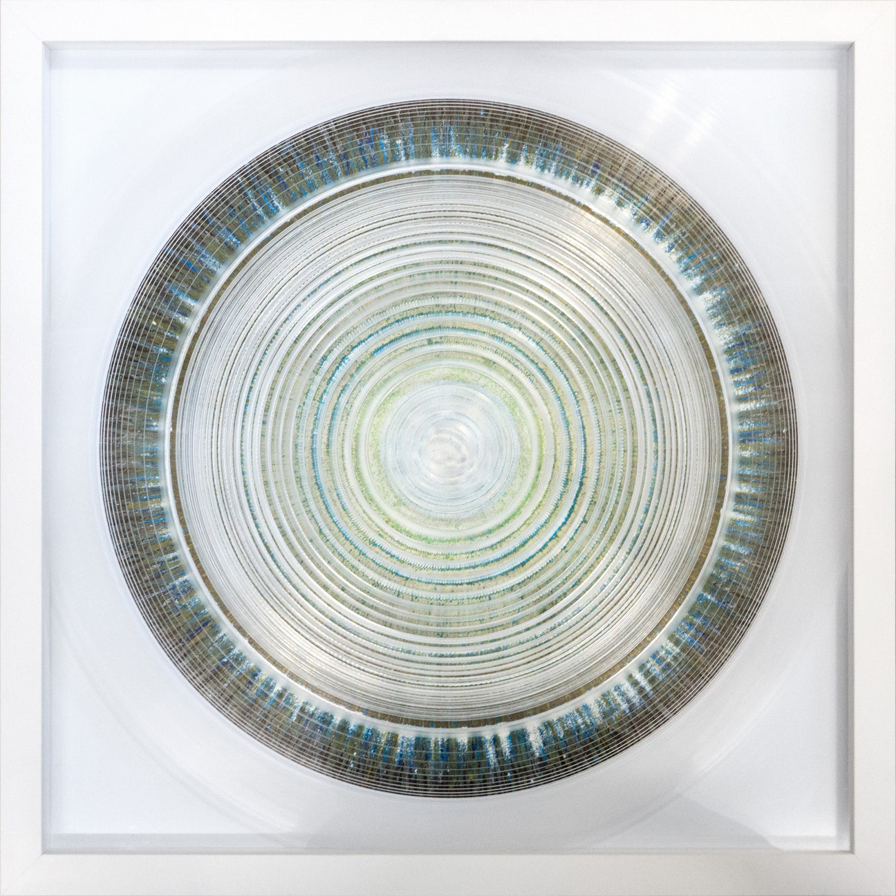 Etched concentric circles radiate outward and contract inward. Che's paintings pulse with energy and flow that bring to mind dynamic motifs of sound and light, the network of life, growth and reflection.