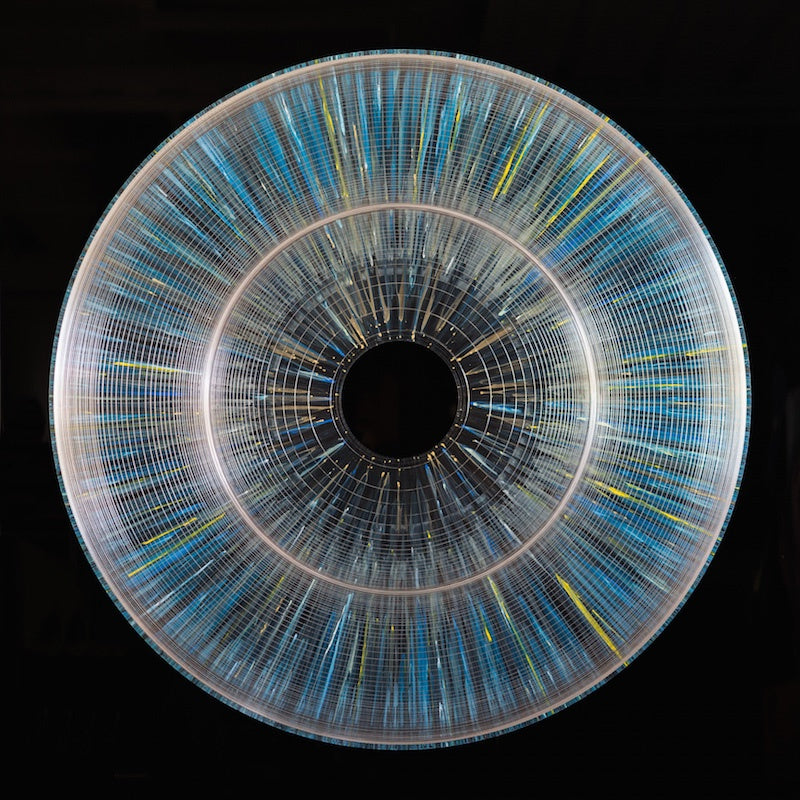 Etched concentric circles radiate outward and contract inward. Che's paintings pulse with energy and flow that bring to mind dynamic motifs of sound and light, the network of life, growth and reflection.