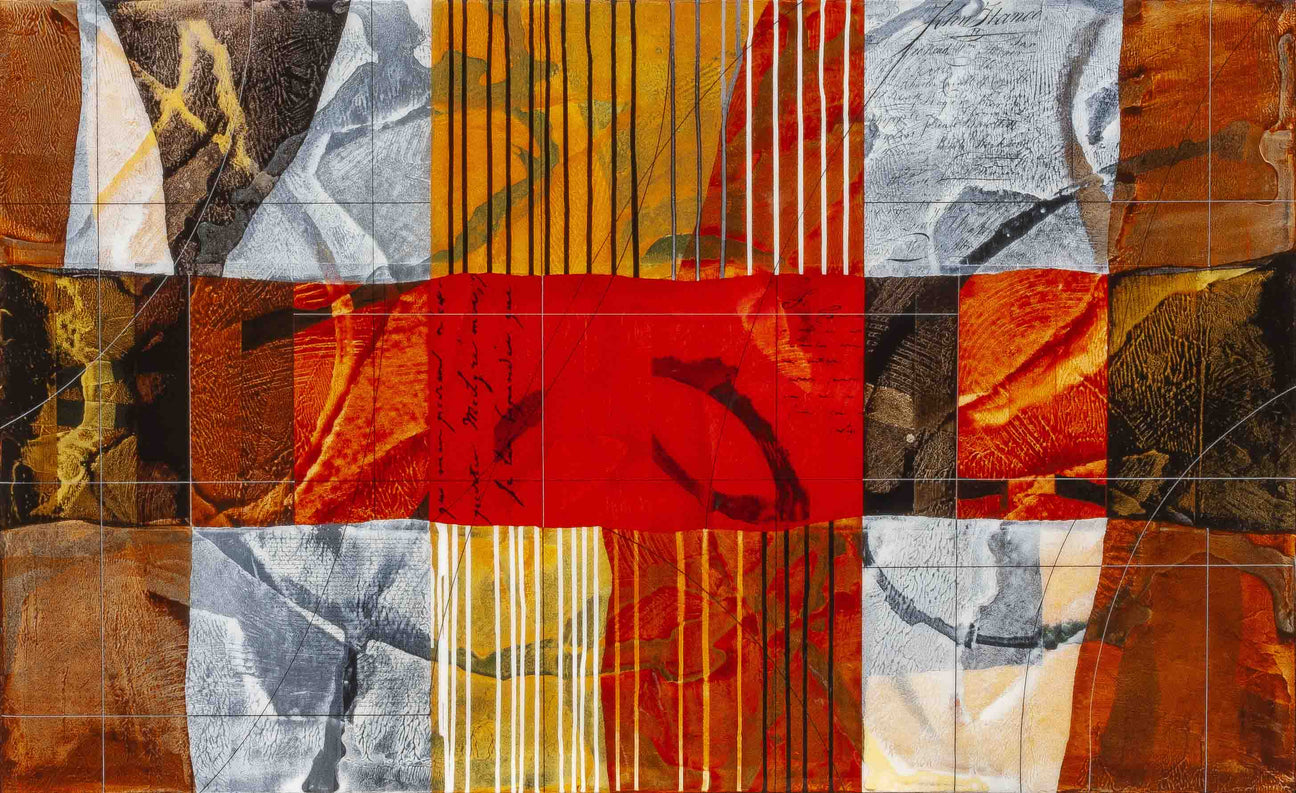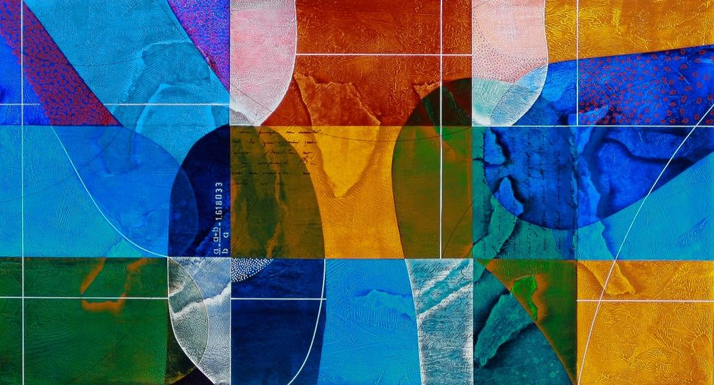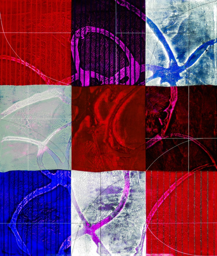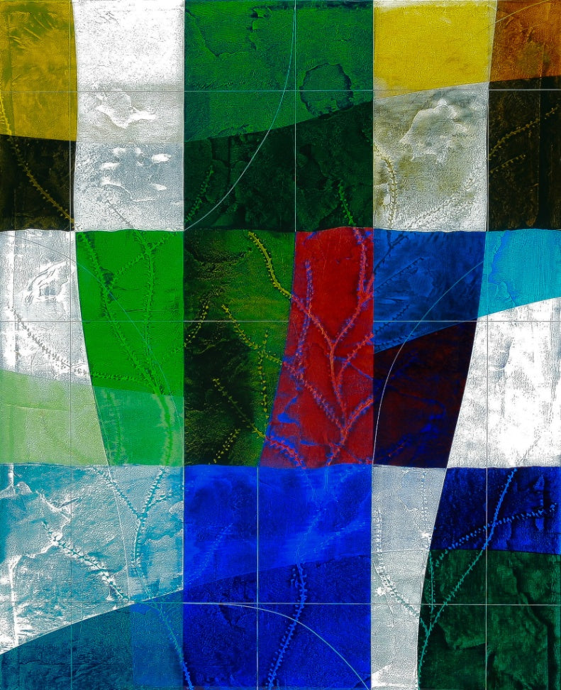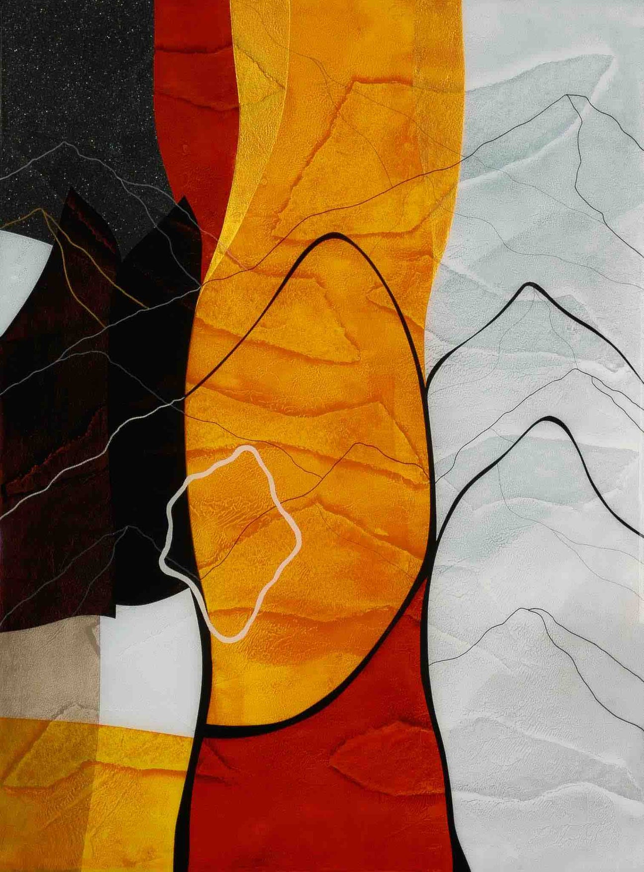 Down proof fabric, acrylic, ink, art resin on plywood board