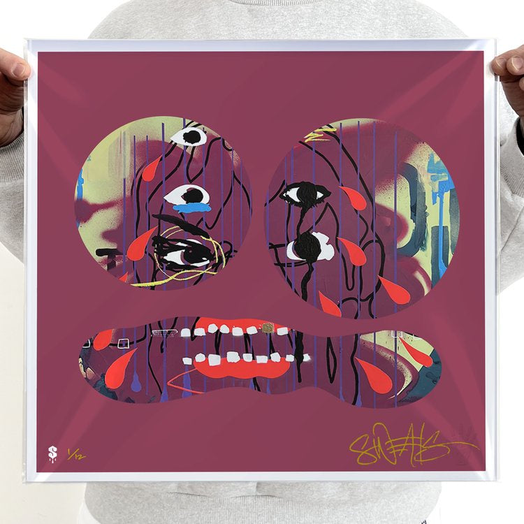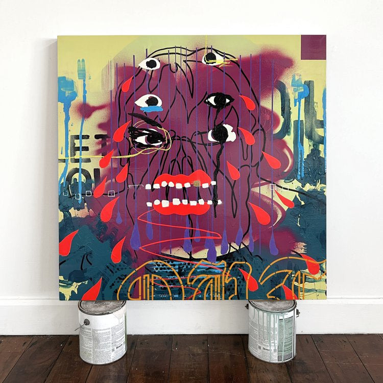 This is a hi-res digital rendition of the original artwork from the Head First collection. The painting was created with enamel spray paint, acrylic paint, oil sticks, hand-cut stencils, using a wide variety of paint applicators. A labour of layered love, sweat for your art.